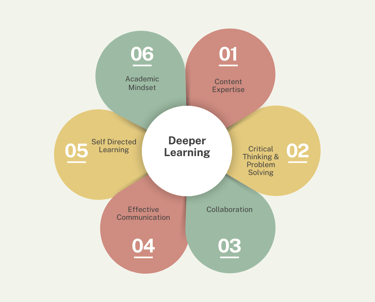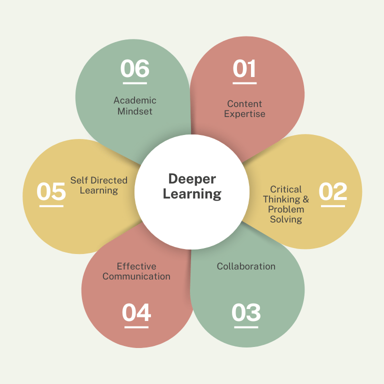 Deeper Learning ist eine zeitgemäße Pädagogik für das digitale Zeitalter. Der Lernprozess findet sowohl eigenständig als auch in Zusammenarbeit statt und führt zu einem tiefen, facettenreichen Verständnis des Lerngegenstandes. Nach dem Wissenserwerb setzten sich die Schüler tiefer mit dem Thema in einer Phase der Ko-Kreation auseinander und erbringen am Ende der Einheit eine authentische Lernleistung, die geteilt wird. Dieser Ansatz ermöglicht es allen Lernenden, Fachwissen zu beherrschen, Kreativität im Lernprozess zu entfalten, kritisch zu denken, in Teams zusammenzuarbeiten, gelingend zu kommunizieren, selbstbestimmt den eigenen Lernprozess zu gestalten und eine wissenschaftliche Herangehensweise zu erlernen.